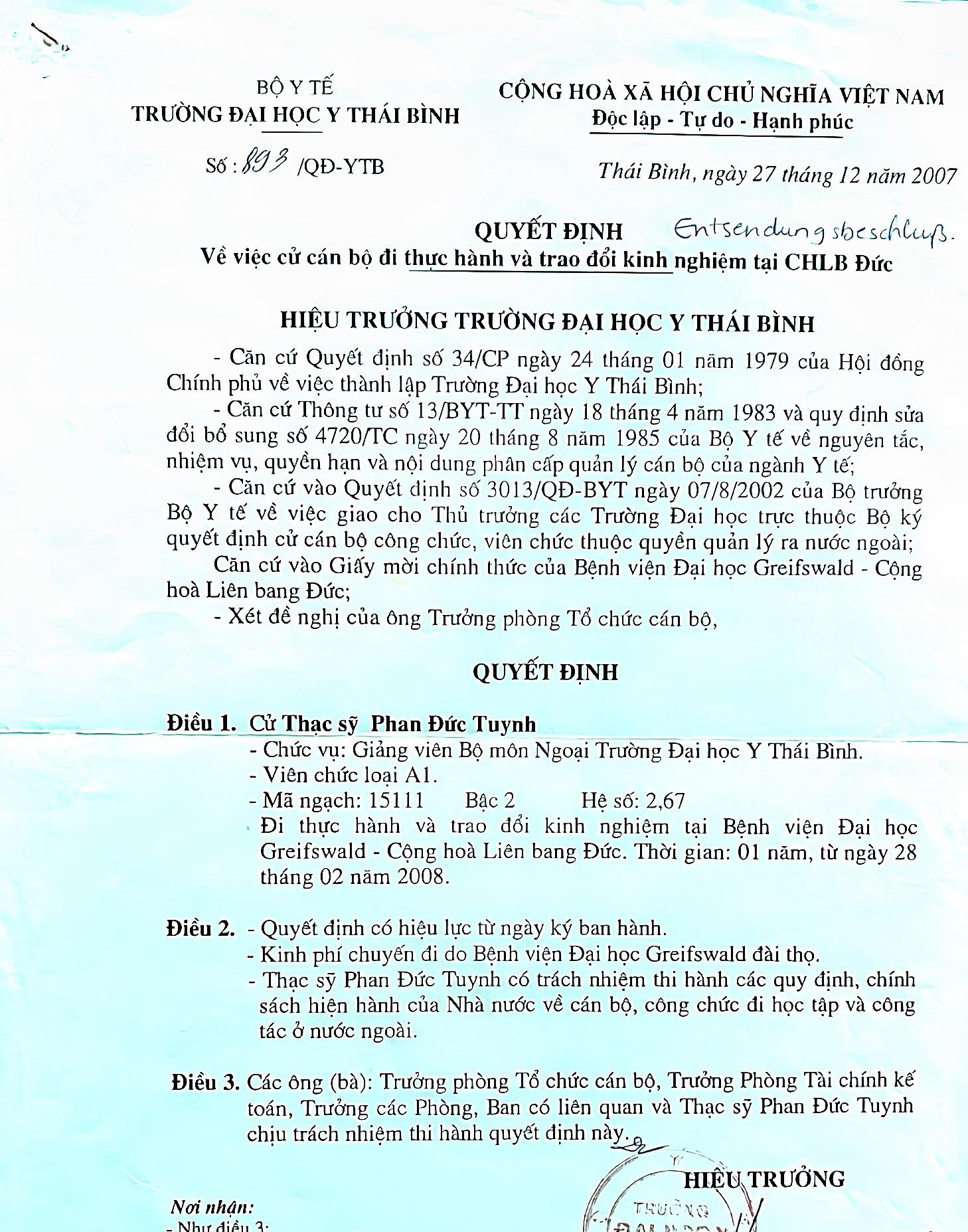 Quyết định cử đi Tu nghiệp ở CHLB Đức