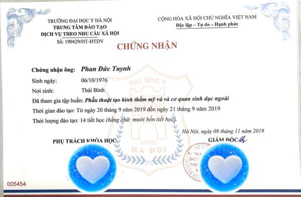 Bs Tuynh học thêm chuyên khoa tạo hình thẩm mỹ tại TPHCM 2015, khi đã có vốn liếng phẫu thuật 14 năm ngoại tổng quát; thạc sĩ y học, du học nước ngoài, quản lý khoa phòng, giảng ...