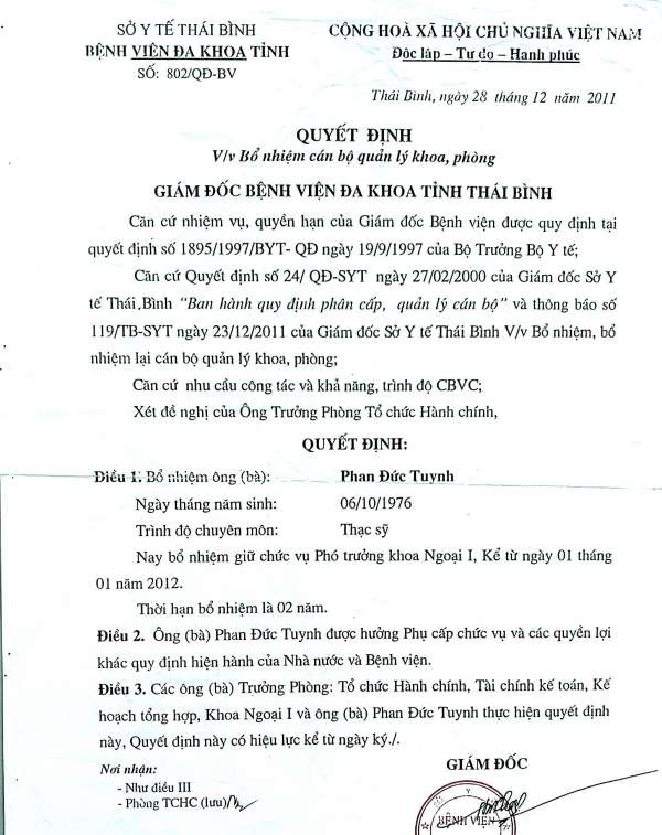Quyết định bổ nhiệm đầu tiên cho Bs Tuynh Với một bệnh viện lớn, một bác sĩ ngoại được đứng tên phẫu thuật là là một vấn đề lớn; được thành trưởng kíp trực lại càng quan trọng (cột 1); rồi trở ...