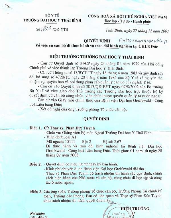 Quyết định cử Thạc sĩ, Bác sĩ Phan Đức Tuynh; giảng viên bộ môn ngoại sang Đức trao đổi và nâng cao kinh nghiệm phẫu thuật, Năm 2007Bác sĩ Tuynh, ngay sau khi tốt nghiệp Đại Học Y Hà Nội 2001; hệ Bs ...